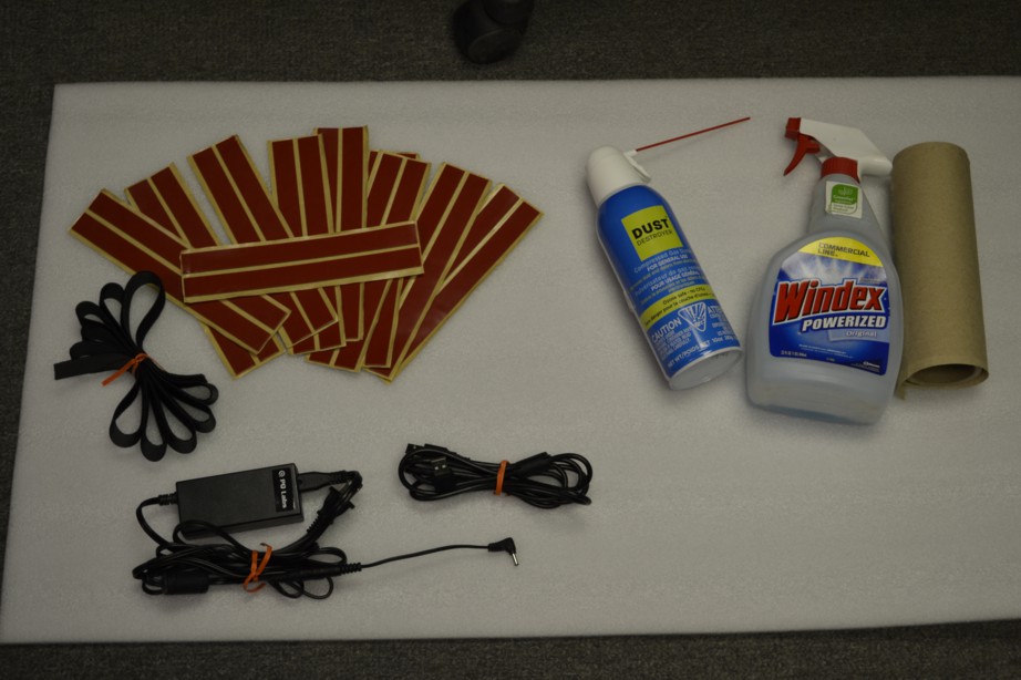 These Only required to clean the glass before assembly Required Materials: Can of compressed air Windex Paper Towels Included Hardware: 10 Sets of Double Sided Sticky Tape 2 Velcro Straps Power Adapter USB Cable with 90 angle