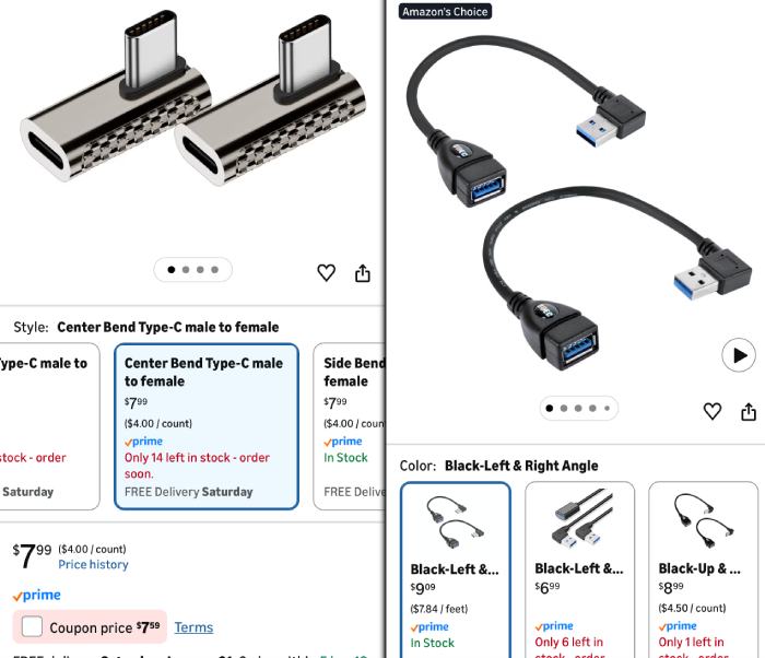 Right angle USB adapters allow a laptop to fit into tighter spaces and prevent cable strain.
